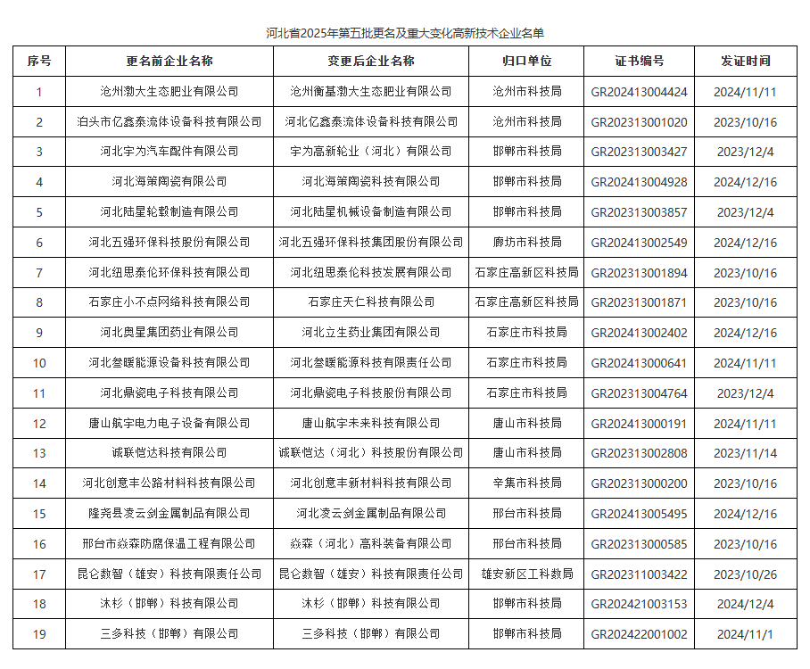 附件:河北省2025年第五批更名及重大变化高新技术企业名单