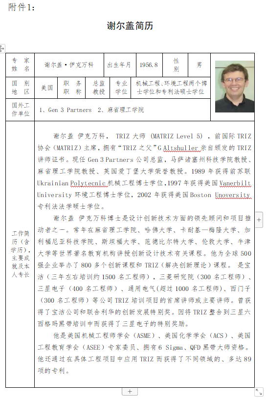 为深入贯彻省委省政府关于人才工作的决策部署,进一步发挥外国专家在推动科技创新、促进经济社会发展中的重要作用。我协会联合河北省科技创新服务中心邀请前国际TRIZ(MATRIZ)协会主席、MATRIZ五级大师、麻省理工学院兼职教授谢尔盖·伊克万科教授团队来石开展“DFP可专利性设计”方法论引进与推广交流活动,现将有关事项通知如下: